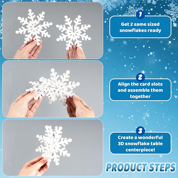 - Unique 3D Design: Featuring an eye-catching 3D structure, these snowflake decorations table top centerpieces add depth and charm to your holiday décor. Simply align and connect the slots of matching snowflake pieces for an effortless, elegant display. They're perfect for bringing a cool, frosty feel to your indoor spaces