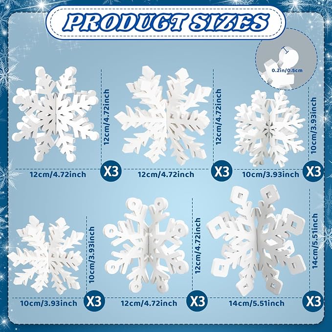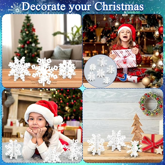 - Elegant Snowflake Centerpieces: Bring the magic of winter to your holiday table with this set of 36pcs white snowflake Christmas decorations. With 5 distinct designs and 3 sizes—3.9", 4.7", and 5.5" in diameter—these 3D snowflake table tiered tray centerpieces are easy to assemble into 18 stunning sets, perfect for creating a festive winter wonderland