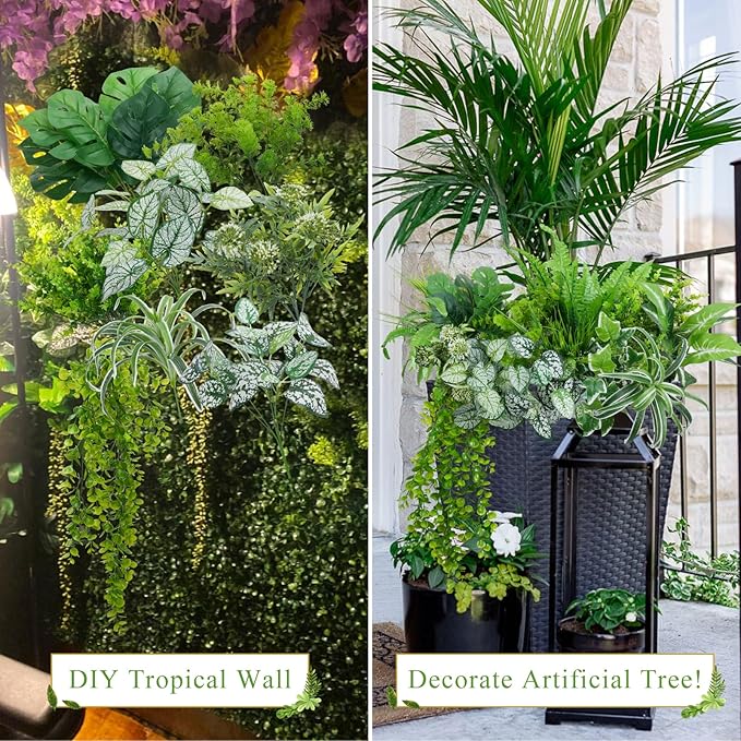 - Unique Outdoor Plants & Flowers: It comes with 13 different kinds of fake greenery, including grass, Boston fern, eucalyptus, palm, etc., a total of 19 pcs. Different from other outdoor plants, we have designed the types and lengths of outdoor plants to make your courtyard look more natural