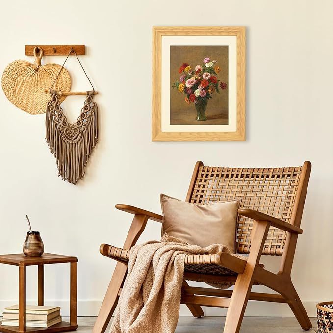 Brivoria Framed Canvas Wall Art Vintage Decor, Classical Floral Art Print with Mat Showing Colorful Zinnias in Vase and Warm Tones for Hallway Dining Room or Seasonal Autumn Wall Decoration, 13"x16"