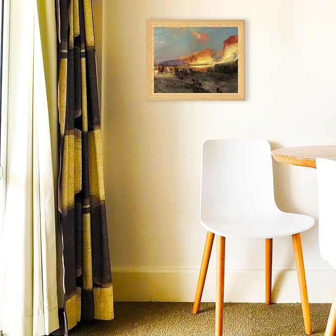 - Dramatic Western Scene by Thomas Moran: This 13x16 inch canvas features “Green River Cliffs, Wyoming,” a bold depiction of sunlit cliffs and mounted riders. The composition adds grandeur and movement to rustic entryways or hallway walls.