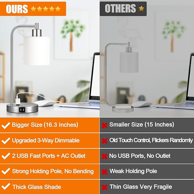 Set of 2 Industrial Touch Control Table Lamps with 2 USB Ports and AC Outlet - 3-Way Dimmable Nickel Bedside Lamp Nightstand Desk Lamps for Bedroom Living Room, Opal Glass Shade & 2 LED Bulbs Included
