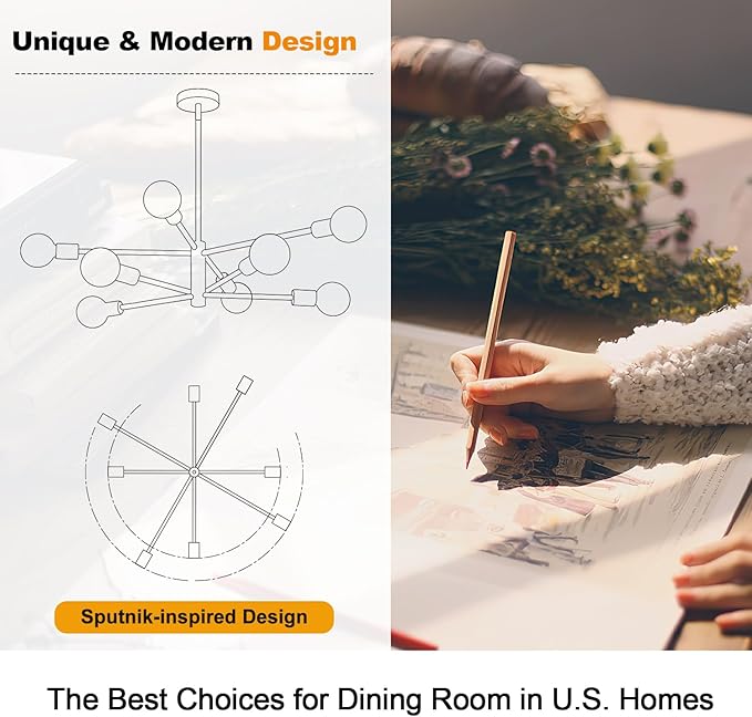 - 【Adjustable Height】Featuring 4 splicing rods, this sputnik ceiling light fixture can be adjusted from 17.0" to 52.3" in height to meet any lighting need, providing stability and reducing shaking. This chandelier for living room is suitable for both sloped and flat ceilings, adapting to diverse room designs.