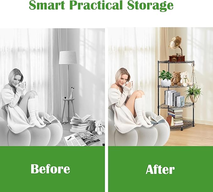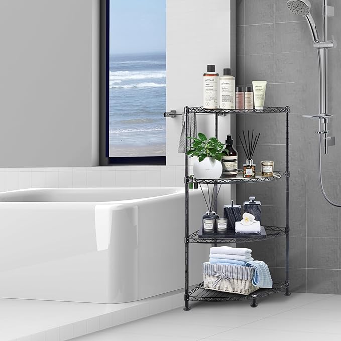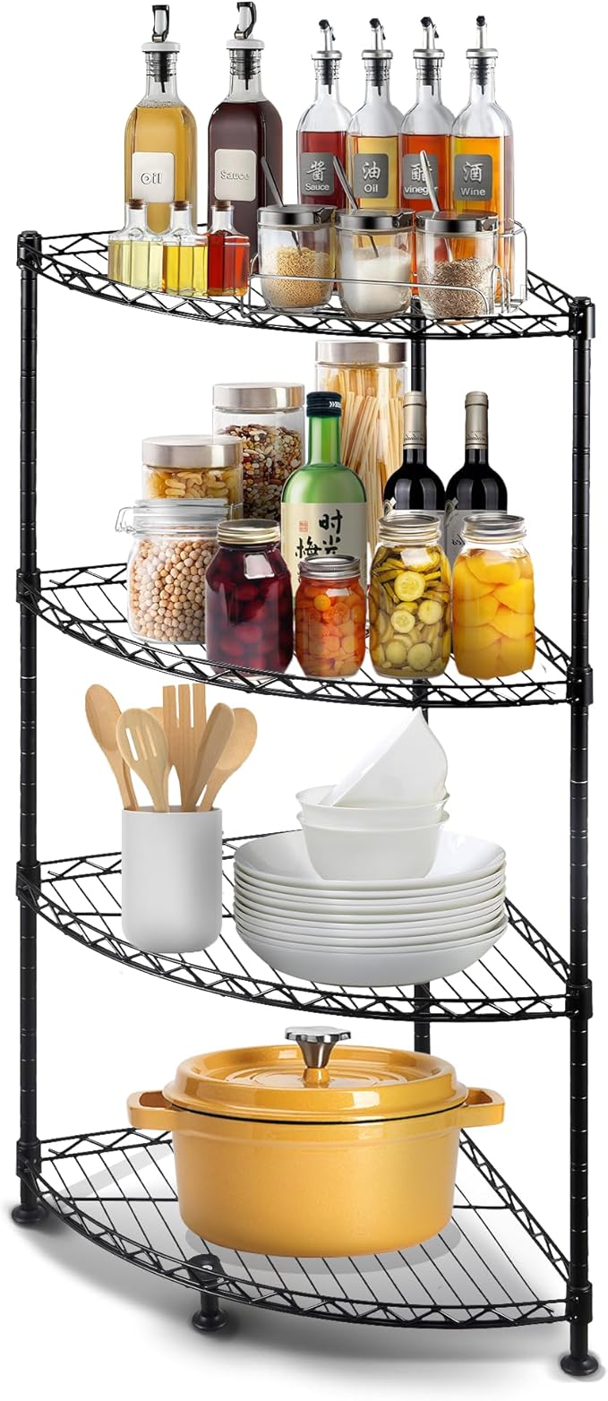 4-Shelf Carbon Steel Corner Storage Shelves with Adjustable Sturdy Wire Shelving Unit, Bookshelf Display Racks Organizer for Bedroom Living Room Kitchen Garage Pantry Closet (Max Load 120kg/265lbs)