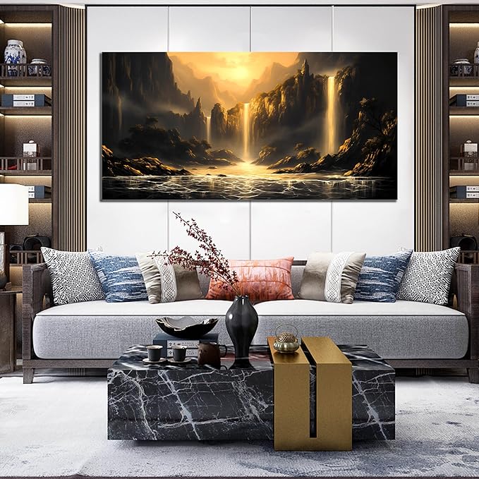 - 【Canvas Wall Art Size】Theme "Black Gold Falls Mountains" This canvas panel is 29 x 58 inch(73cmx147cm)One piece set.