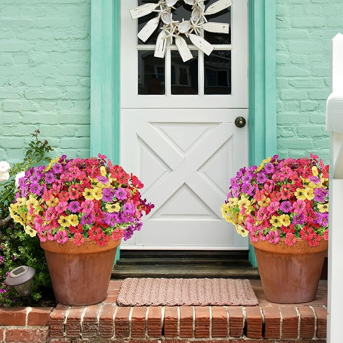 - Perfect for Outdoor/Indoor - Plastic flowers are ideal for outdoor porches,walkway,terraces windox box,front yard,pots,hanging planters,gardens,landscape,windowsills, allowing you to have beautiful colors all year around.Also suit for birthdays, Halloween decor, memorial place or grave,they can live anywhere and have withstood heavy rain storms and winds.