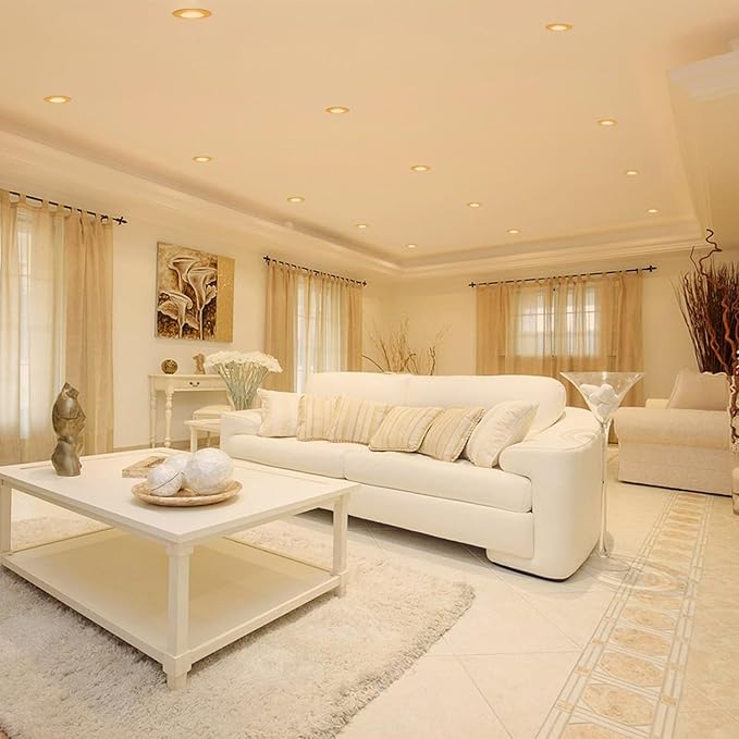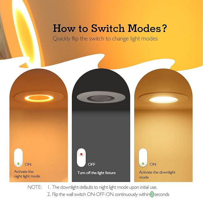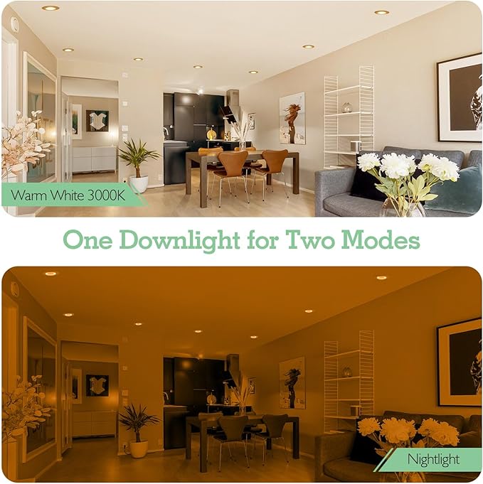 - Night Light Feature-Two Modes In One: The 6 inch recessed lighting with night light features two modes,switch effortlessly between 3000K Downlight Mode and 2000K Night Light Mode using a standard wall switch.The night mode emits 2000K soft glows around the trim of the downlight for creating a warm and soft ambience