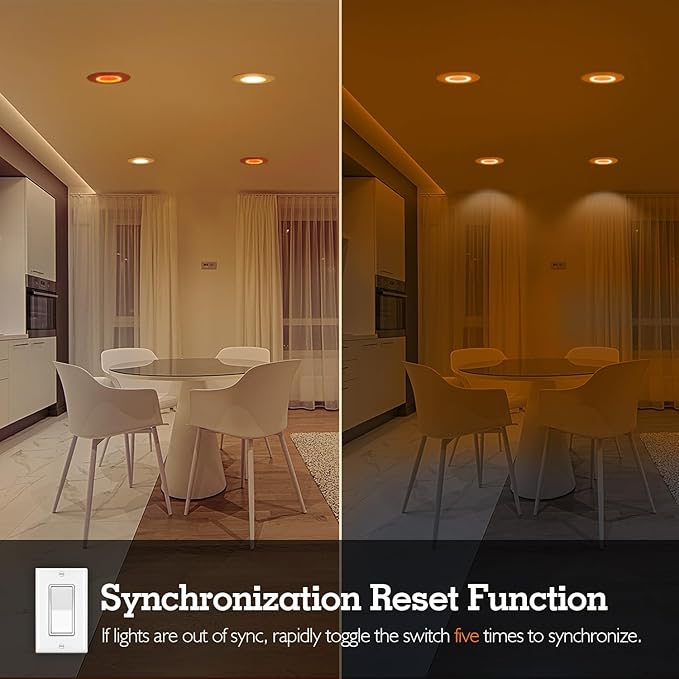 - Synchronization Reset Function:the 6 inch led recessed lighting retrofit with night light will remenber the last mode used and return to that state when powered back on.if you find that the lights are not in the same mode, rapidly toggle the switch five times to get all the retrofit downlights to switch to the same mode