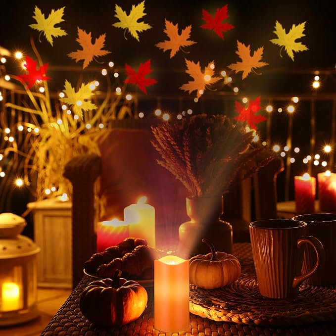 - Maple Leaf Projection: embrace the cozy warmth of autumn with our unique pillar candle featuring a stunning maple leaf projection; Once lit, the candle itself glows invitingly while an internal projector casts vibrant colors and four distinct maple leaf patterns onto your ceiling; Simply place the candle on a table, and enjoy the mesmerizing display that embodies the essence of fall