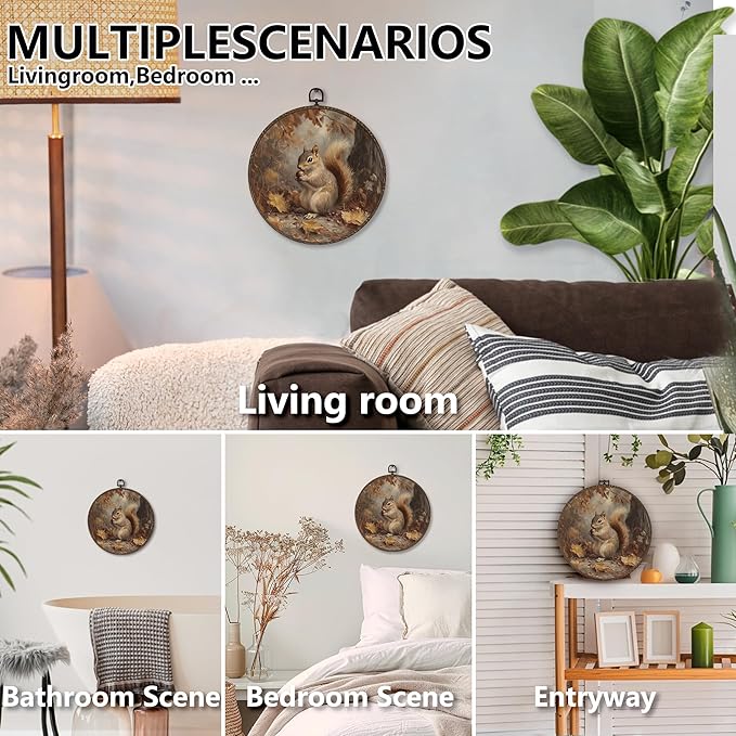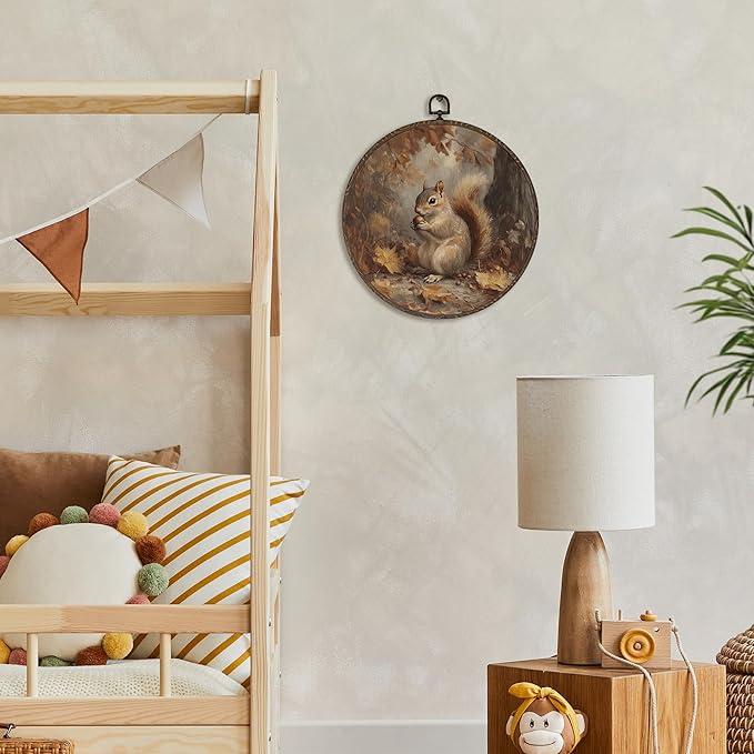 XNXLDYLH Vintage Fall Squirrel Round Framed Wall Art Decor, Rustic Farmhouse Woodland Hanging Wall Decor Decorations, Autumn Fall Canvas Prints Wall Art Paintings for Bedroom Living Room, 10x10 Inch