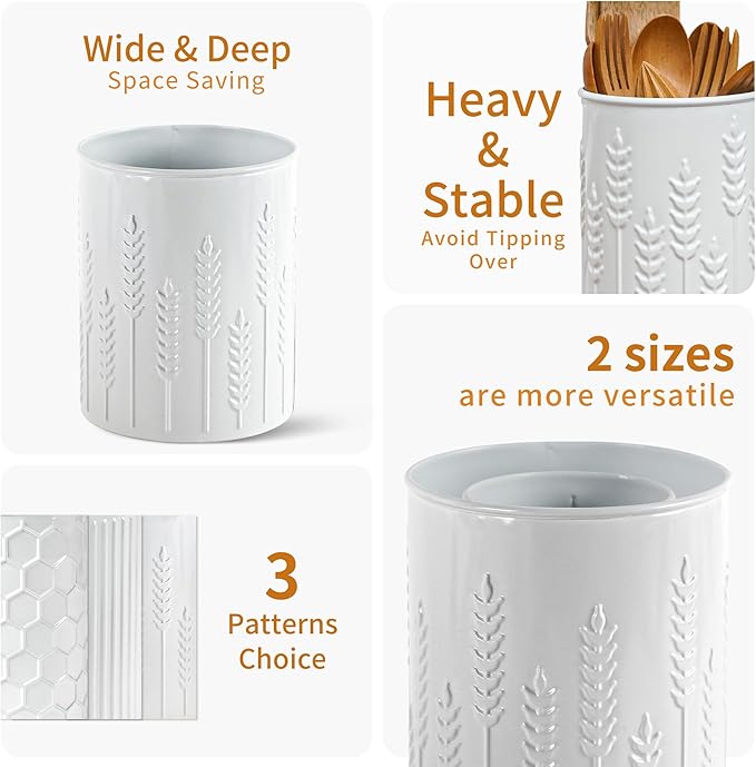 2 Pack Metal Utensil Holder for Kitchen Counter, 7.3"+5.4" Large Cooking Utensil Organizer Ear of Wheat Pattern Embossed Utensil Caddy for Party Cutlery Tool Holder Storage, White