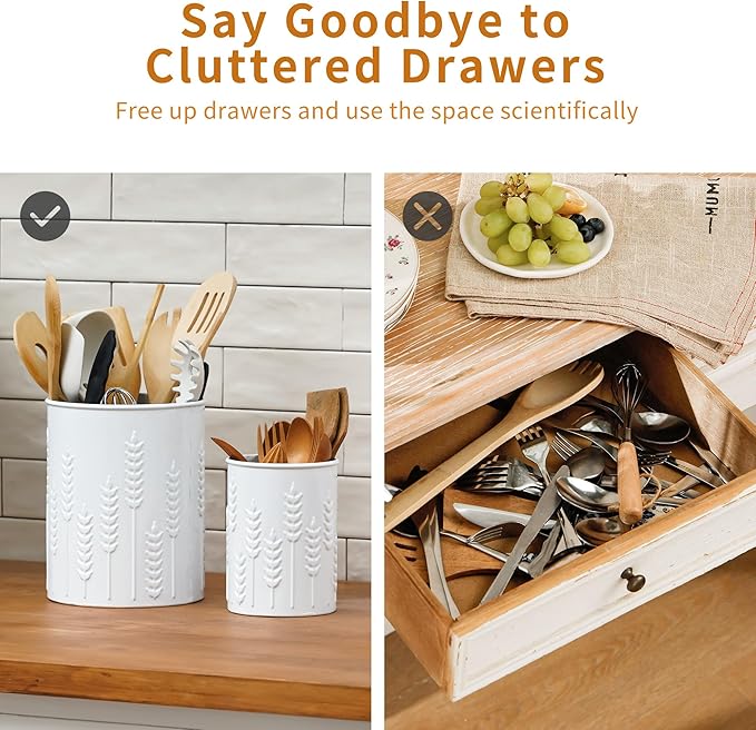 - DUAL-SIZE DESIGN: The Set includes two metal utensil crocks - the large caddy measures 7.28" tall and 5.91" wide, and the small one measures 5.4" tall and 4" wide for versatile storage options