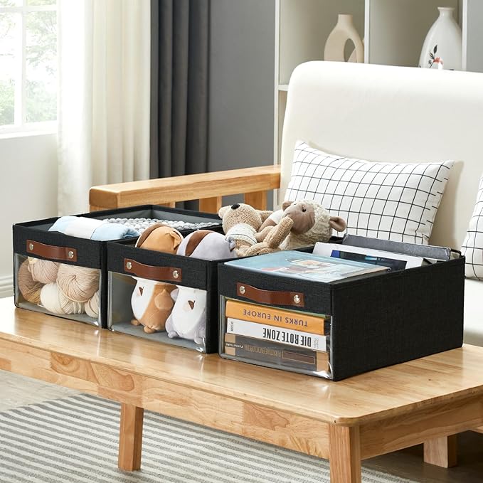 Medium Storage Baskets with Clear Window, See Through Closet Organizer with PU Handles, Linen Foldable Storage Bins for Organizing Clothes, Toys, Books (Black)