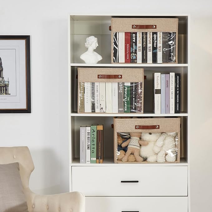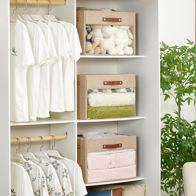 - Dual-Function Clear Window Design: Effortlessly identify contents at a glance with the front PVC clear window—no more rummaging through stacks to find what you need! The back side of storage basket retains a classic and non-visual design, letting you choose between quick visibility or discreet storage. Perfect for organizing closets, shelves, or kids’ rooms while keeping spaces tidy and stylish.