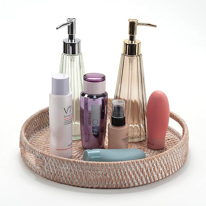 16.9" Round Rattan Tray, Hand Woven Serving Tray with Handles, Wicker Serving Basket, Decorative Tray for Home Decor, Whitewash