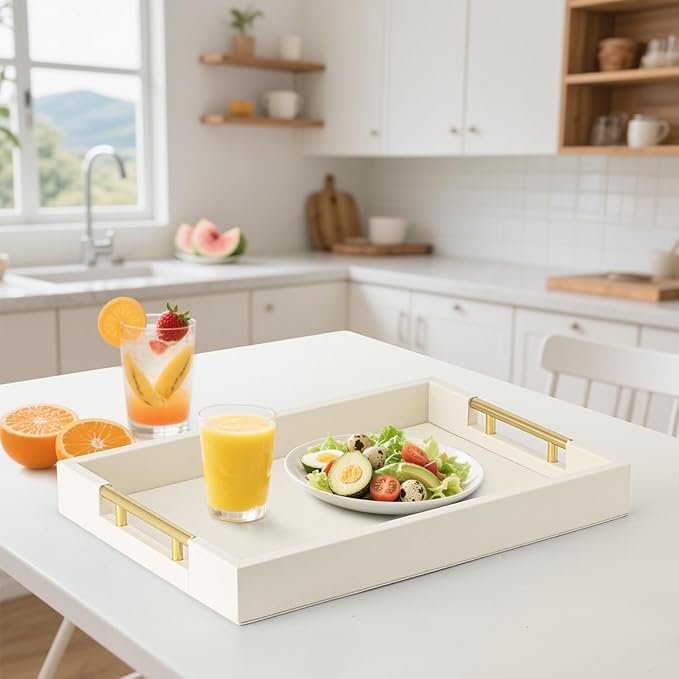 Ivory Faux Leather Serving Tray with Handles – Large Decorative Tray for Coffee Table, Ottoman, Living Room, Bathroom – Home Decor