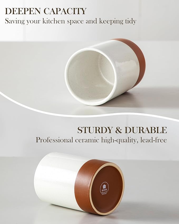 - 【PREMIUM CERAMIC WITH STYLISH KITCHEN DECOR】Crafted from durable, high-fired ceramic, these utensil holders feature a distinctive sesame seed speckle pattern over a warm khaki base with crisp white accents. The TARA series design blends effortlessly into modern, farmhouse, or rustic kitchens, elevating both your cooking experience and the overall look of your home.