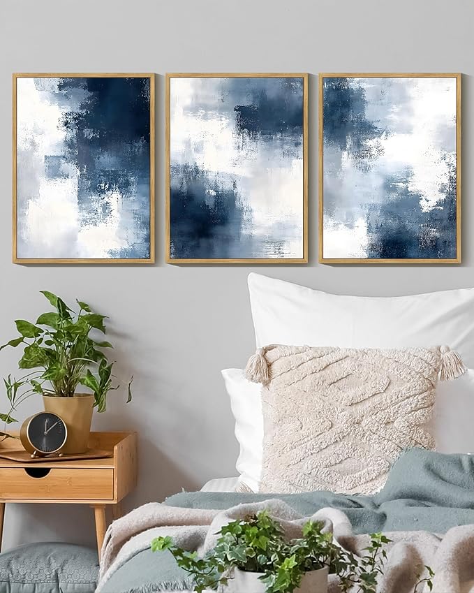 KUVIOKE Navy Blue Abstract Wall Art Framed Neutral Brush Strokes Block Shape Mid Century Art Prints Minimalist Modern Illustrations Bedroom Hallway 11x14in (Natural Framed)