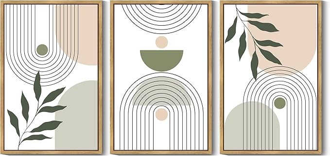 KUVIOKE Boho Green Sage Neutral Wall Art Framed Bohemain Botanical Geometric Modern Wall Prints Decor Ready to Hang 24x36in (Natural Framed)