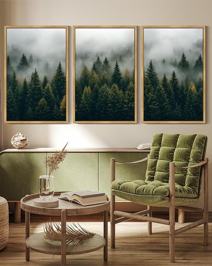 KUVIOKE Green Fog Pine Tree Landscape Framed Wall Art Nature Nordic Misty Forests Prints Morden Farmhouse Bedroom Living Room Ready to Hang 16x24in (Natural Framed)