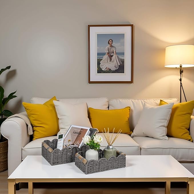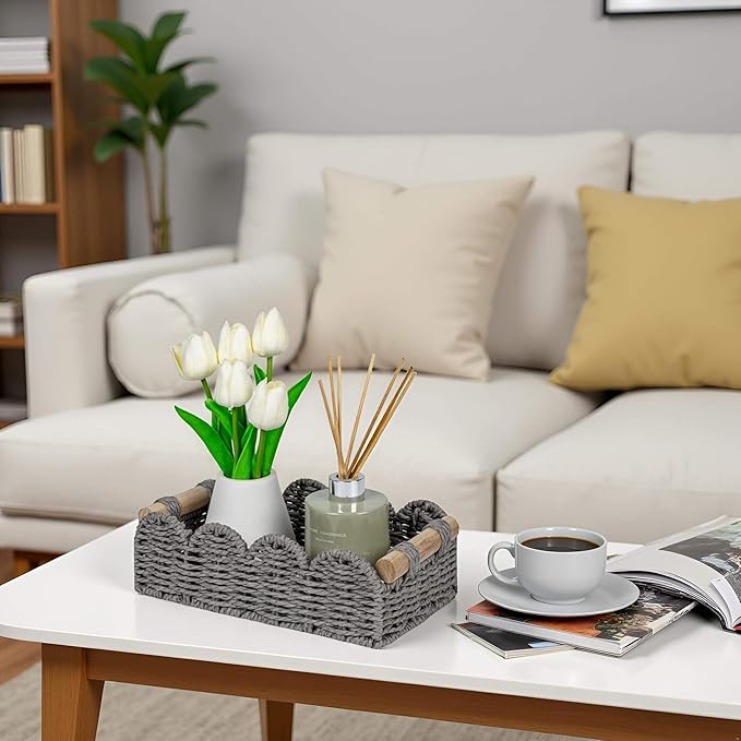 - MULTIPURPOSE USE: Our scalloped edge paper rope decor basket add personality and charming addition to bedroom, living room, bathroom and space-floating shelves, over toilet storage shelf, end table, nightstand,storage cabinet, bookcase and more, also serve well to small items, beauty products, cleaning supplies, and more
