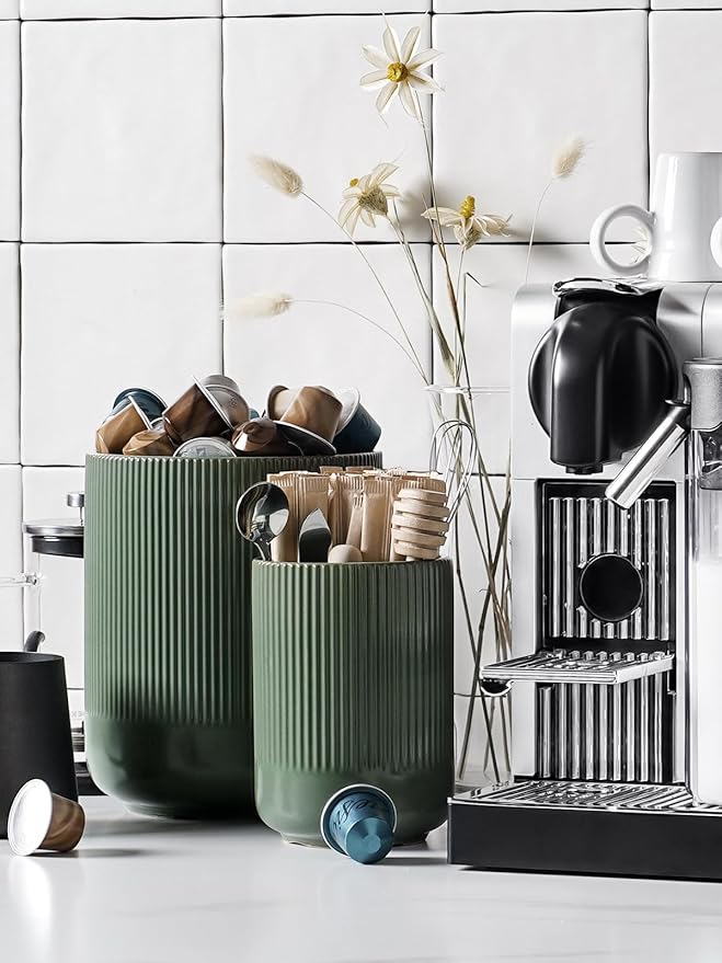 LE TAUCI Utensil Holder, 7.3"+5.4" Ceramic Kitchen Utensil Holder for Countertop, Large Cooking Utensil Crocks for Kitchen Counter, Modern Utensil Organizer for Spatula, Set of 2, Forest Green