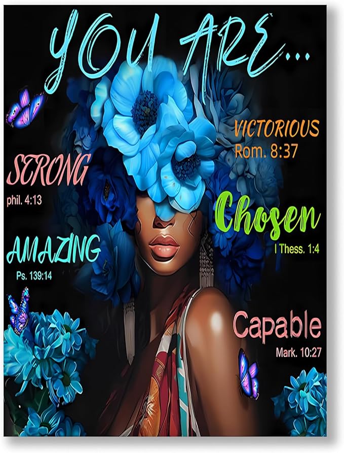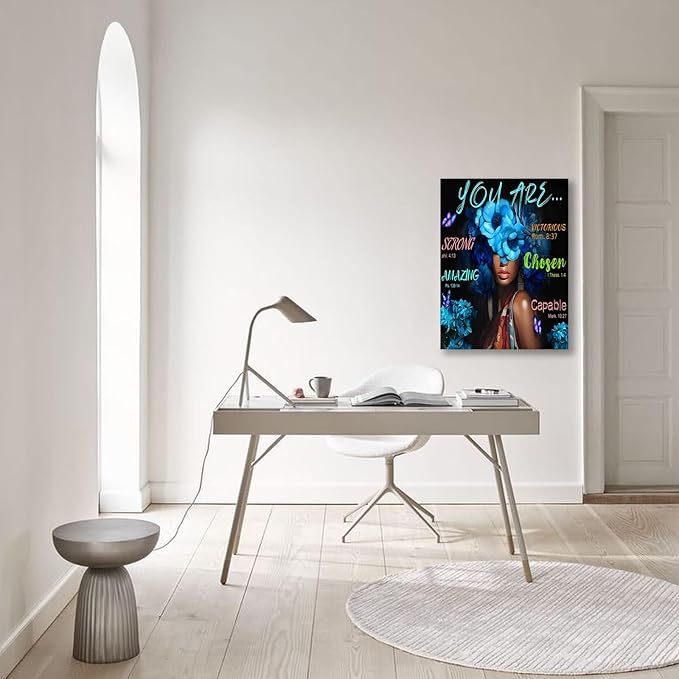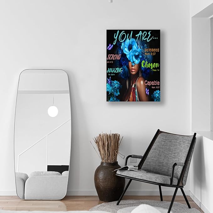 - ARTISTIC DESIGN: Beautiful canvas wall art featuring vibrant blue floral design with inspirational scripture quotes against a striking black background