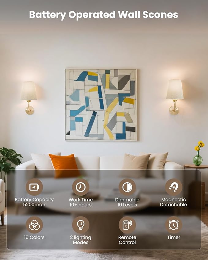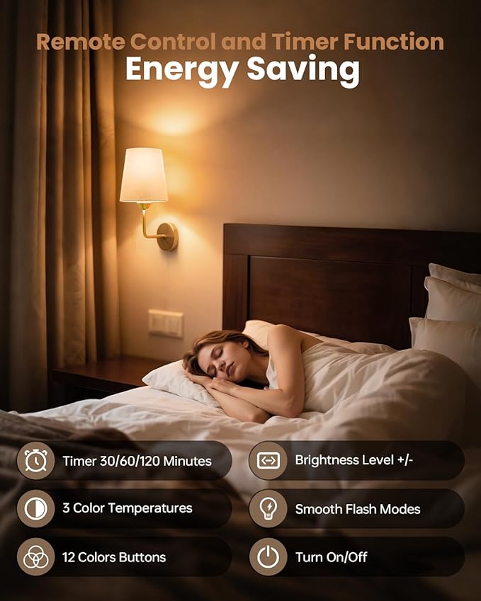 - 【2 Remotes, Dimming, and Timer Function】 Included 2 remotes for each sconce. The remote controls allow you to turn the lights on and off quickly, select colors, lights modes, adjust brightness, and set a timer for 30, 60, or 120 minutes, providing ultimate convenience and customization. Makes wireless sconces highly convenient for various spaces and needs, whether for reading, ambiance, or as a nightlight