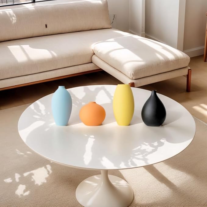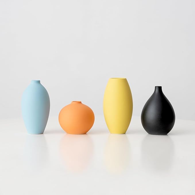 - Small Colorful Ceramics vase set (matte): Ceramic Vase set is a combination of 4 vases of different shapes and colors. Yellow,Orange,Light blue and Black,4 colors, simple and compact, beautiful and generous. More suitable for decorating office desks, desks, bookcases, makeup tables, dresser coffee table decoration etc small space.The bottom of the vase is polished smooth, will not damage the desktop or furniture, you can rest assured that use