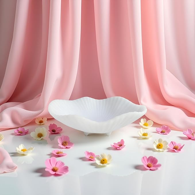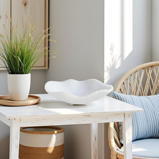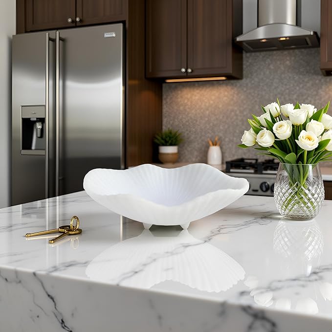 Large Decorative Bowl decor, Scalloped Pedestal Bowls,Modern Home Decor,Ruffle Decor,Stylish Key Bowl for Entry Table,Decorative Fruit Bowl for Kitchen Counter, Artificial Stone Milky white