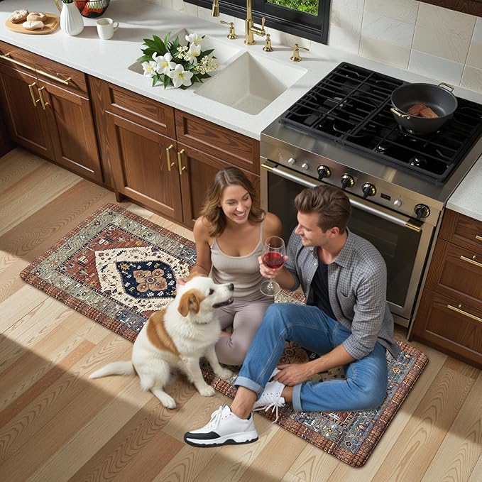 - Versatile: Boho style design features a central medallion and floral motifs in the style of rugs,easily to match your kitchen decor,bright your home.Soft thick foam provides ample support for standing in kitchen sink,laundry room, office,bathroom,dinning room,or any other high-traffic area