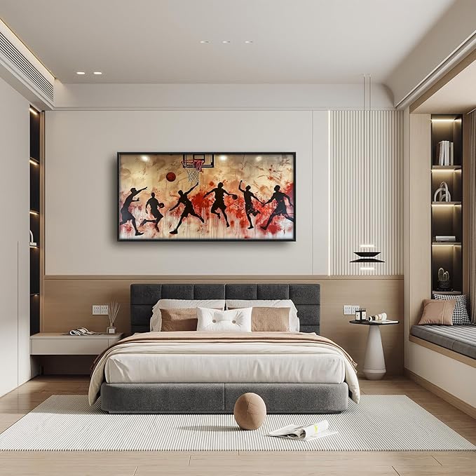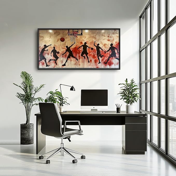 Flintis Large Basketball Sports Framed Wall Art Basketball Players Pictures Wall Decor Abstract Graffiti Canvas Painting Print Artworks Framed for Living Room Bathroom Master Bedroom 60L X 30W