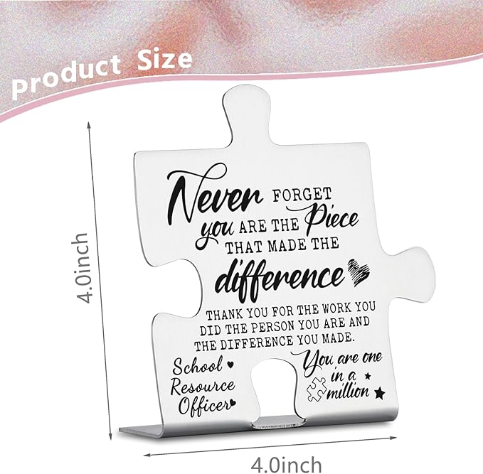 - 【School Resource Officer Appreciation Gifts】Featuring the heartfelt phrase “Never forget you are the piece that made the difference,” this plaque honors the commitment of school resource officers.