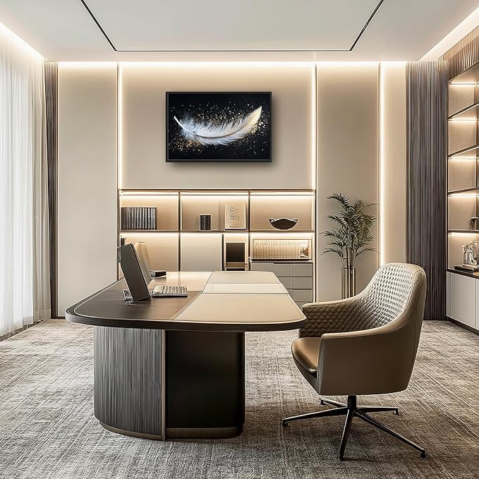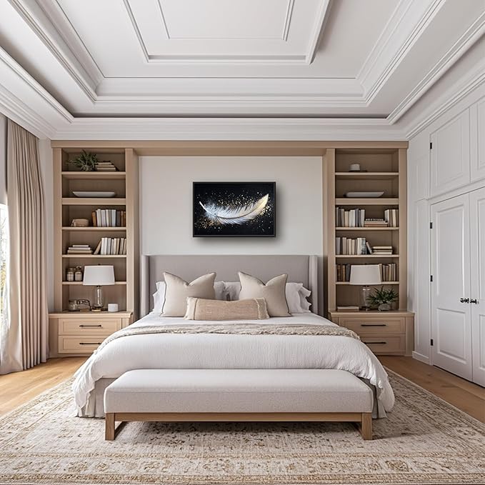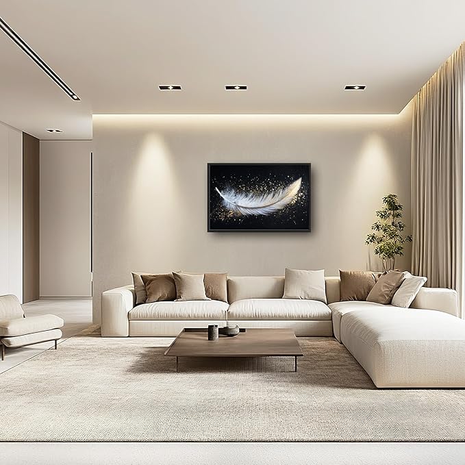 Flintis Large Feather Framed Wall Art White and Gold Feather Pictures Wall Decor Abstract Modern Canvas Painting Print Artworks Decor Framed for Living Room Bathroom Master Bedroom 36L X 24W