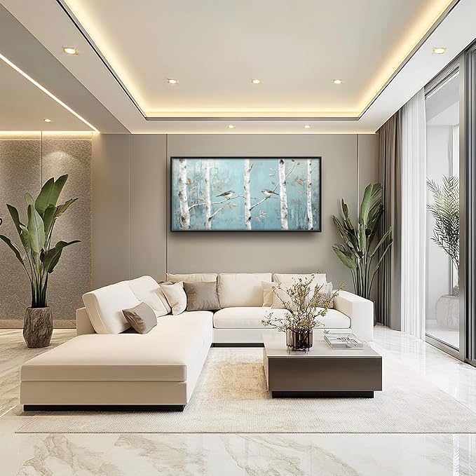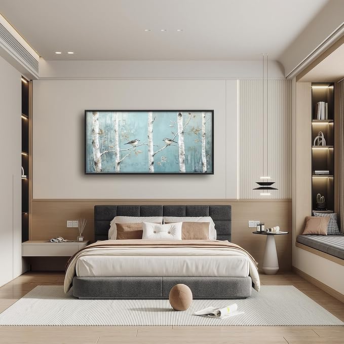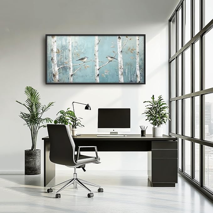 Flintis Large Birch Tree Bird Framed Wall Art Forest Birds Pictures Wall Decor Abstract Natural Landscape Canvas Painting Print Artworks Framed for Living Room Bathroom Master Bedroom 60L X 30W