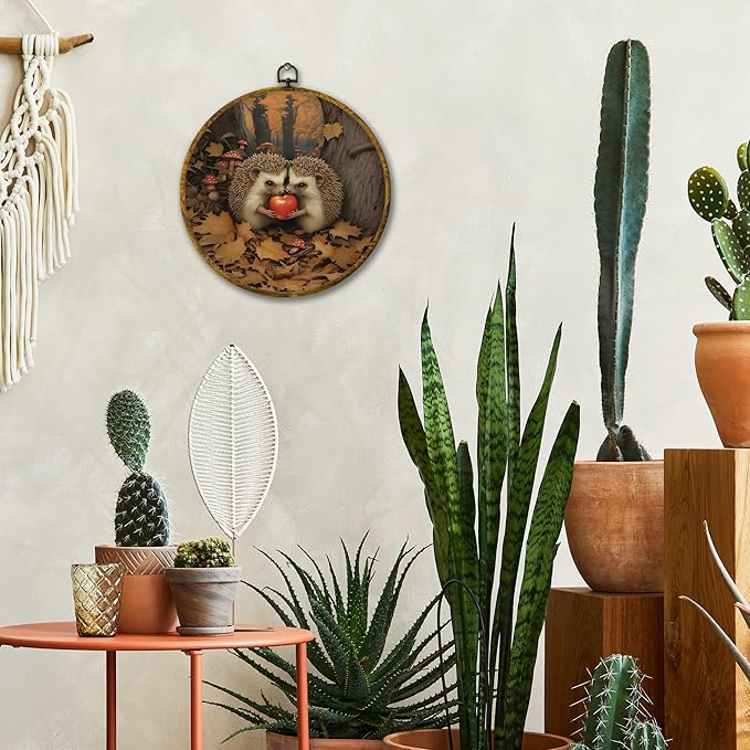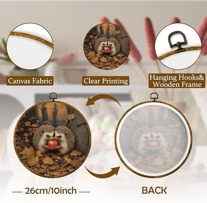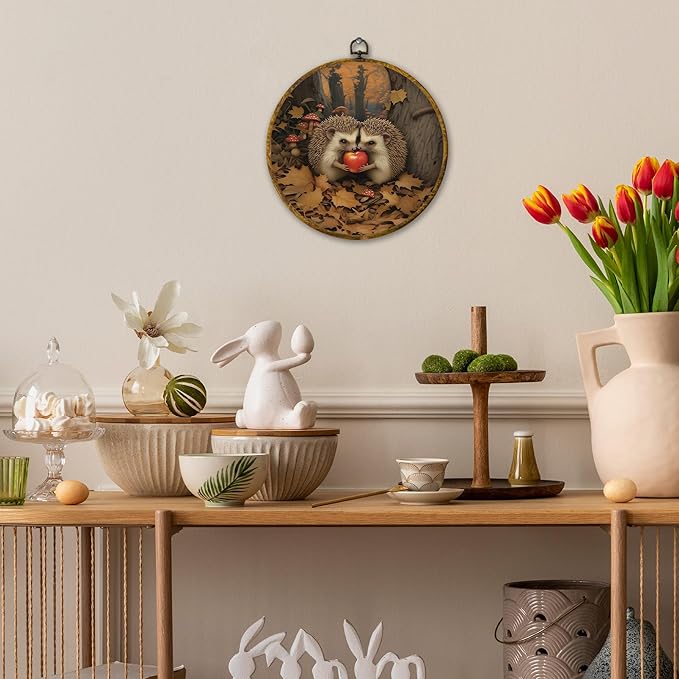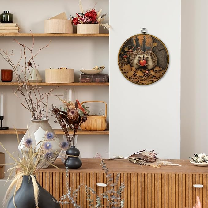 Mcehtle Vintage Fall Hedgehog Wall Art Decor,Rustic Autumn Cottagecore Forest Framed Canvas Prints 10x10, Animal Wildlife Maple Leaves Round Wall Hanging Artwork Decorations for Home Bedroom Gallery
