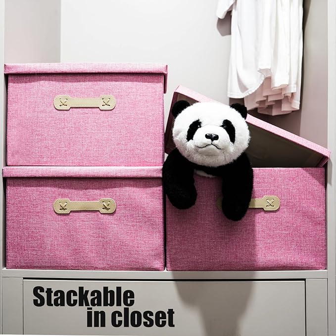 Enzk&Unity Decorative Storage Bins with Lids, Fabric Linen Foldable Storage Box with Handle Home Organizer for Shelf, Closet, Bedroom, Living Room, Office, 3 Packs, Pink