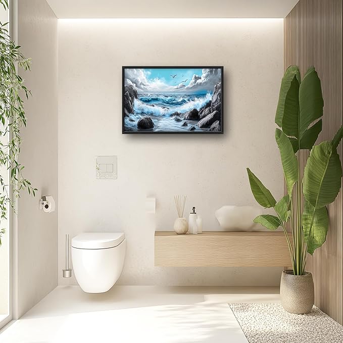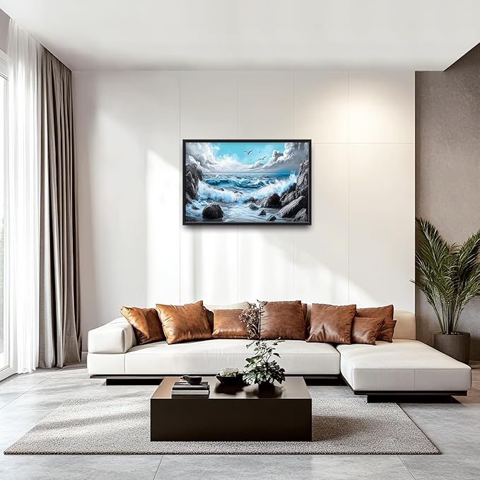 - 【Unique Design】 A stunning ocean scene with crashing waves, rocks, and seagulls in the sky. The blue sea, white clouds, rocks, seashore, sea foam, seashells, waves splashing on the shore, and a blue sky create a breathtaking landscape. The black rocks and stones contrast with the blue waves and water, resulting in a serene and captivating scene.
