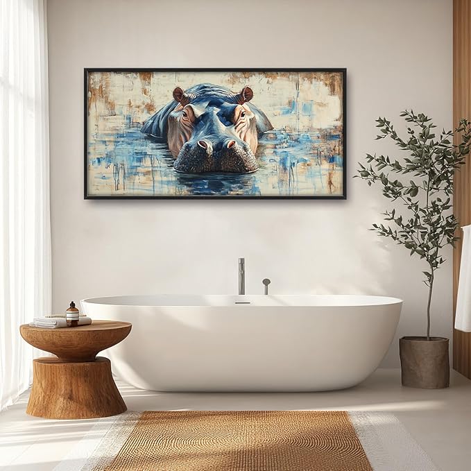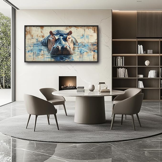 Extra Large Framed Abstract Hippo Wall Art,Oversized African Hippopotamus Wild Animal Wall Decor,Vintage Pictures for Living Room,Canvas Print Painting Modern Artwork Bedroom Office Bathroom 60L x30W