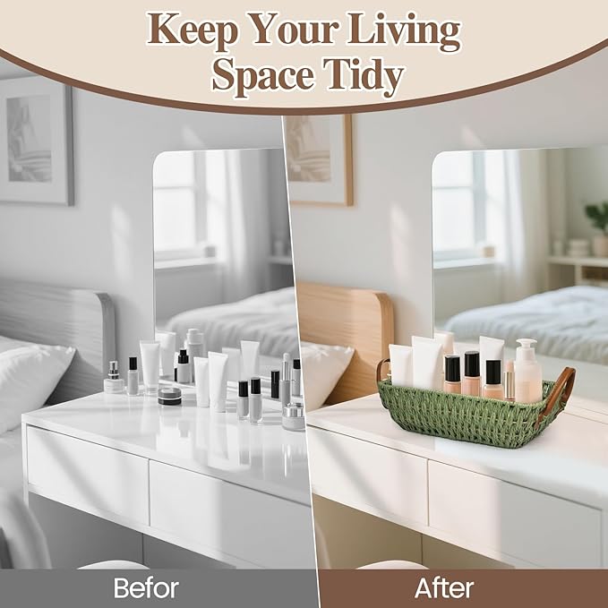 - Multipurpose Use: Handmade Baskets for Decor are Home Essentials to Save Storage Space and Make Life Orderly Well-Organized, for Organizing Toilet Paper Rolls, Towels, Jewelry, Makeup, Office Supplies, Fruits, Veggies, Snacks, Newspapers, Snacks , Socks, Candy, Toiletries Etc Small Items.Small Wicker Basket to Keep Your Living Space Tidy.