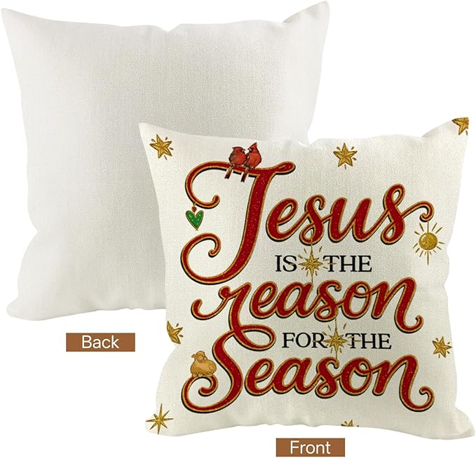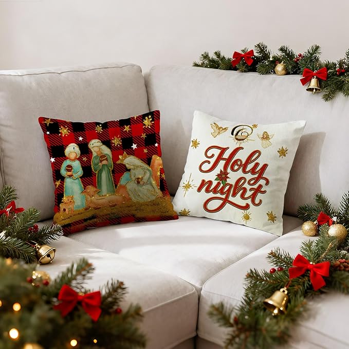 Christmas Holy Night Jesus Cardinal Pillow Covers 18x18 inch Set of 4, Holiday Winter Red Plaid Vintage Xmas White Seasonal Gold Decorations for Sofa Couch
