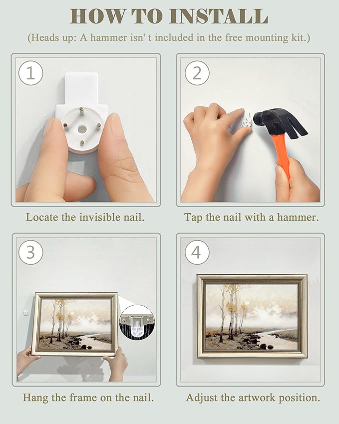 - [READY TO HANG] This framed wall art comes fully assembled with a secure hook, traceless nails, and adhesive strips. Includes all hanging accessories for quick, hassle-free setup—ideal for canvas wall art, framed wall decor, or decorative wall prints