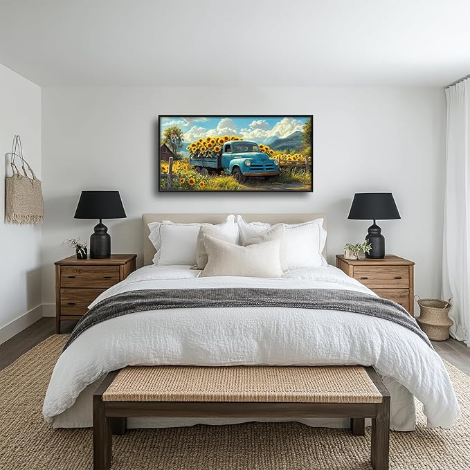 Olivine Large Wall Art, Sunflower Pictures Wall Decor, Farmhouse Sunflower Painting, Sunflowers Truck Canvas Prints, Framed Artwork for Living Room Bedroom Bathroom Office Home Decoration 60"x30"