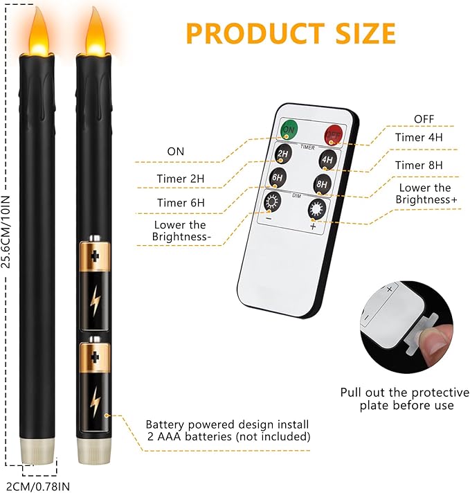 - Value Pack: 6 pcs black fake candles, 1 remote cantrol, 1 user manual. Single taper candle size is Height 10" x Diameter 0.78". Each battery operated candle is thoroughly and rigorously tested before sale. If any problems during use, please contact our Customer Support Team, we will always be at your service.