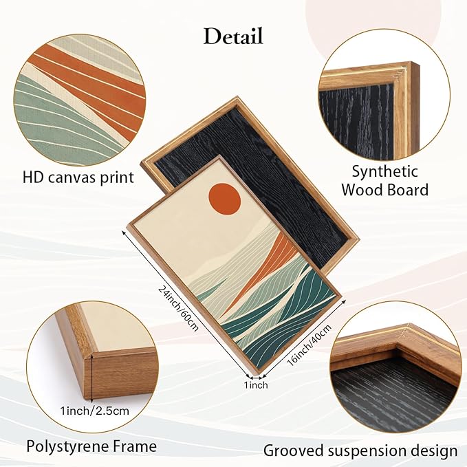 - MODERN COASTAL STYLE WALL ART: The decorative paintings feature a modern abstract design with soothing shades of green, blue, and orange as the primary tones. They skillfully integrate elements of waves and geometric shapes to create a fresh and serene coastal aesthetic.