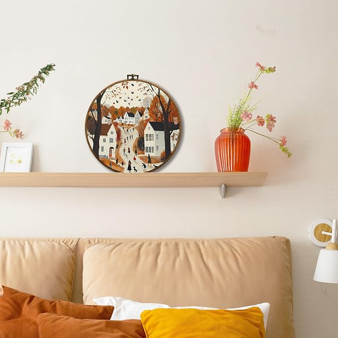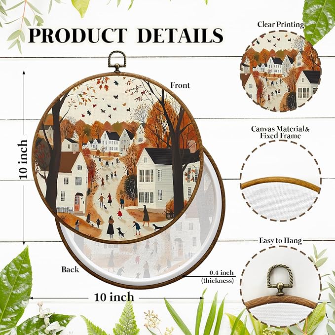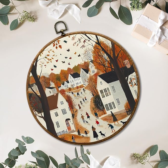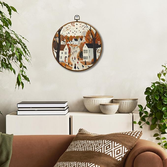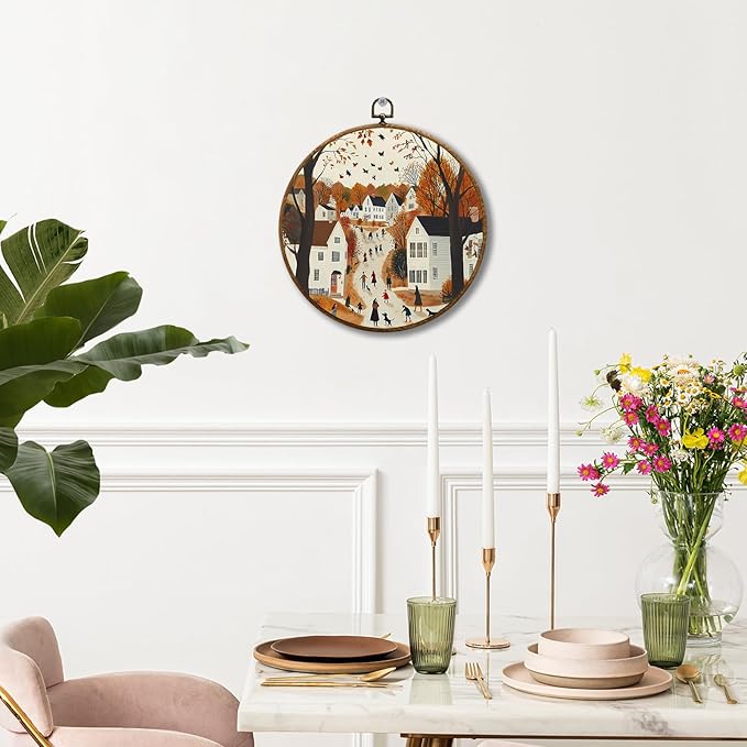 JUIOEIU Fall Round Wall Decor, Cozy Autumn Cityscape Seasonal Framed Canvas Prints, Fall Wall Art Hanging Decorations for Home Bedroom Living Room Office Decor, 10x10in