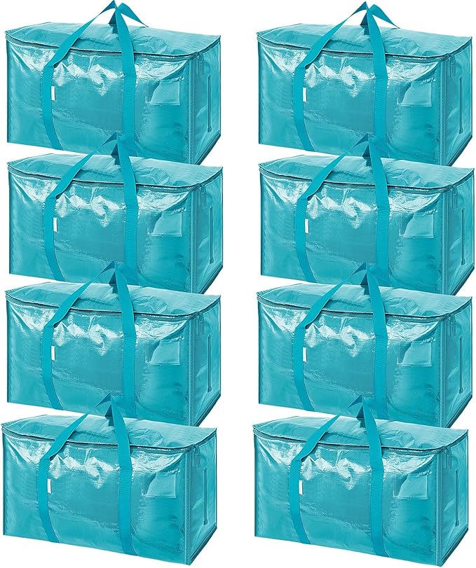 TICONN 8 Pack Extra Large Moving Bags with Zippers & Carrying Handles, Heavy-Duty Storage Tote Moving Boxes for Space Saving (8 Pack, Aqua)