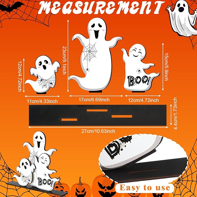 - 3 Styles Ghost Design for Autumn: with 3 different Halloween ghost designs, our wooden Halloween ghost decoration for home nicely catches the essence of halloween; It has laser cutting and is covered by fiberboard; The delightful decoration will instantly bring a warm and cozy feel to your home; Each wooden ghost centerpiece on the stand is different, their sizes are suitable for decorations and the combination of them is exquisite
