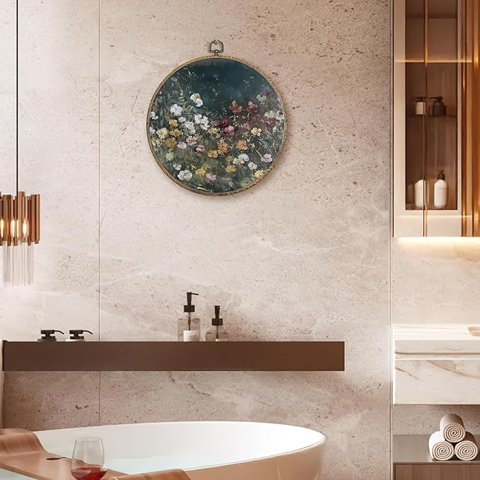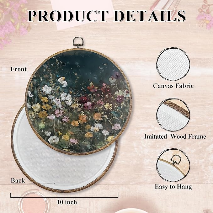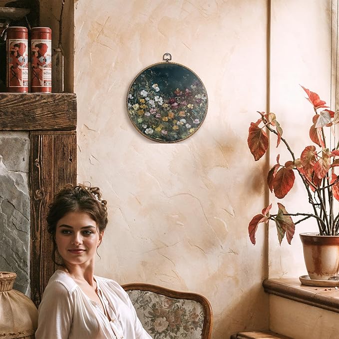 FUGWN Dark Cottagecore Moody Wildflower Round Wall Art Decor Framed, Vintage Flower Botanical Canvas Artwork Prints, Retro Colorful Floral Wall Hanging Decorations for Home Bedroom Room, 10x10 Inch