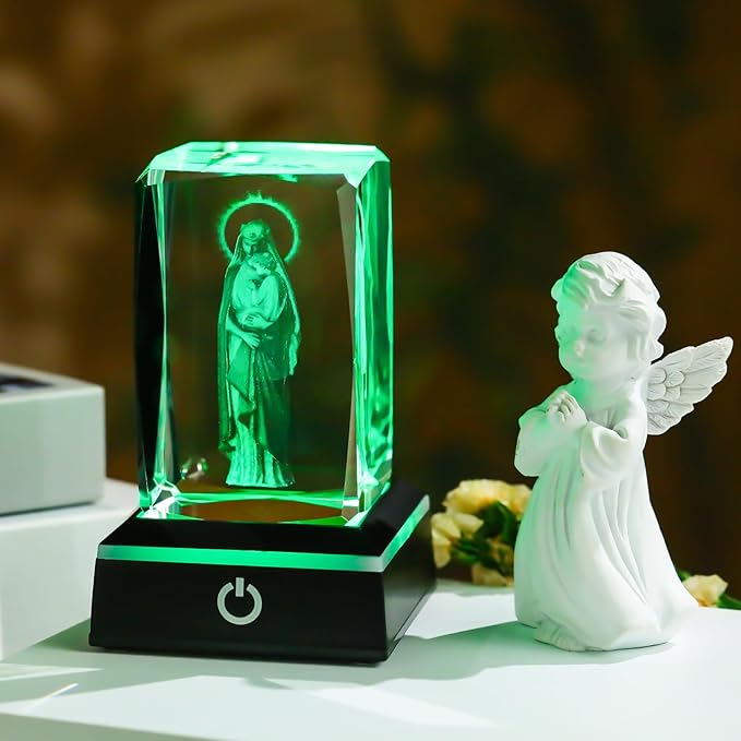 - Elegant Gift Set with Luxe Packaging - Includes crystal cube, LED base, USB cord, gift box, microfiber cloth, and greeting card. The Blessed Virgin Mary statue casts a peaceful glow on desks, dining tables, or churches – a timeless Madonna and Child statue for spiritual solace.